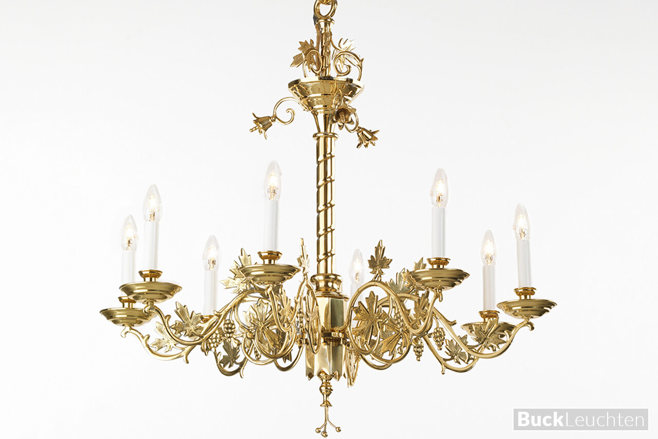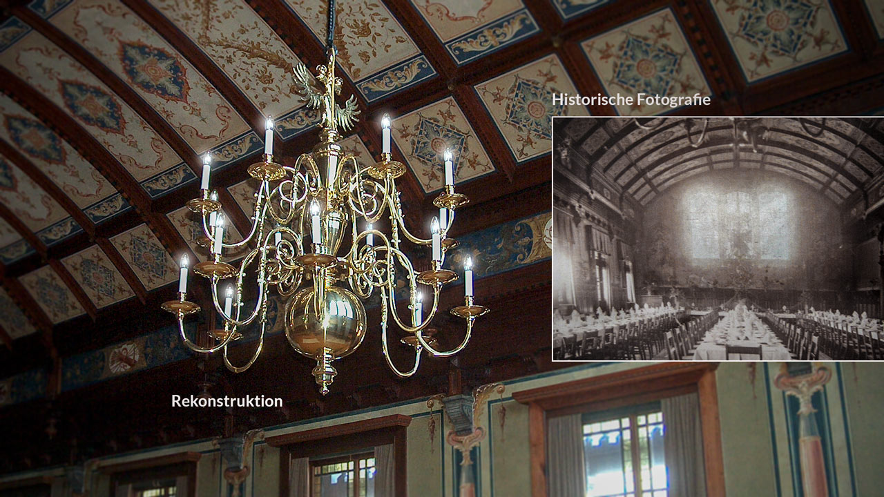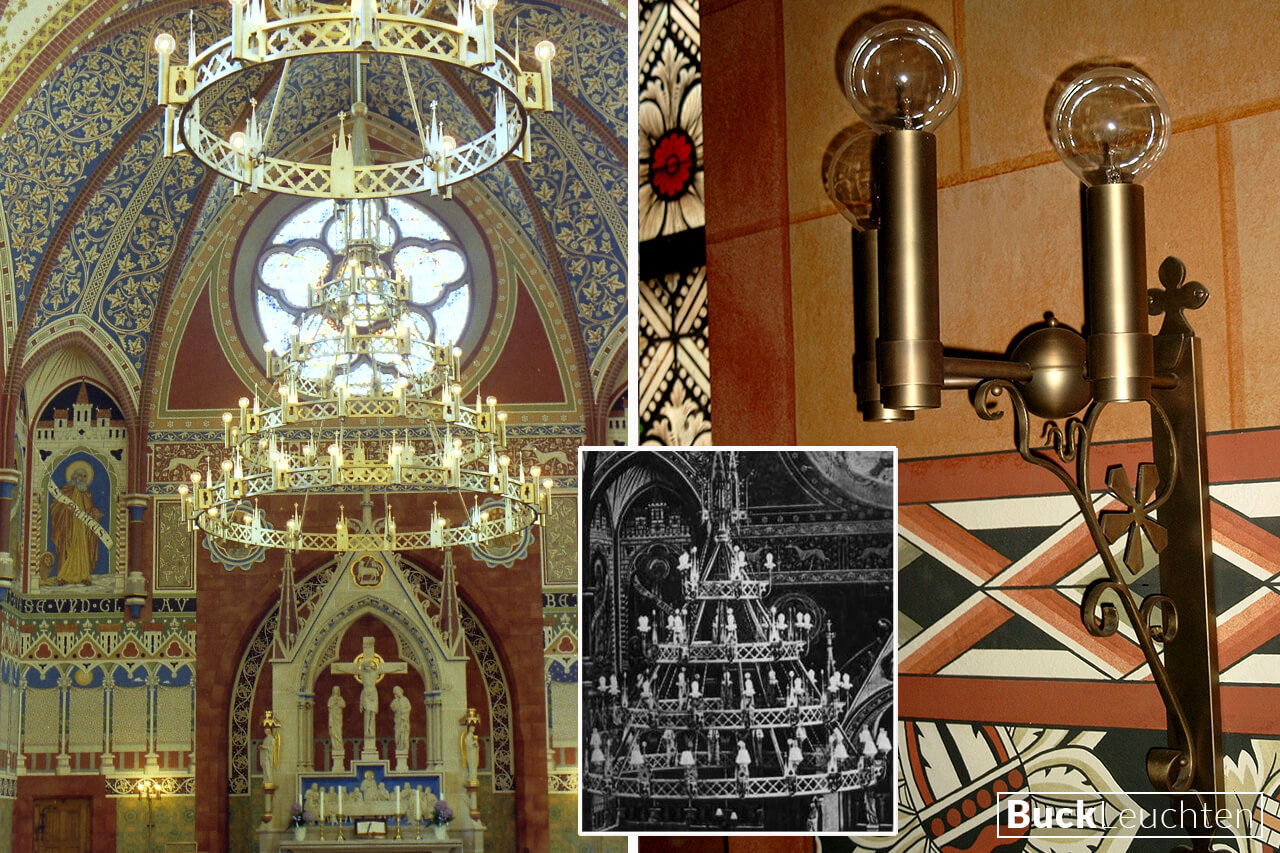 Hier durften die ehemals vorhandenen drei großen Kronleuchter und die damaligen Wandleuchter nachgefertigt werden. Ein zu sehendes altes Foto zeigte schemenhaft die Leuchter zur Erbauungszeit 1894. Nach einer intensiven Bearbeitung des Bildes waren nach und nach Details zu erkennen. Es wurden Zeichnungen und Gussmodelle angefertigt. Danach wurden die drei Kronleuchter und auch die Wandleuchter nach der alten Vorlage in Abstimmung mit der Denkmalpflege als hochwertige Repliken nachgefertigt.