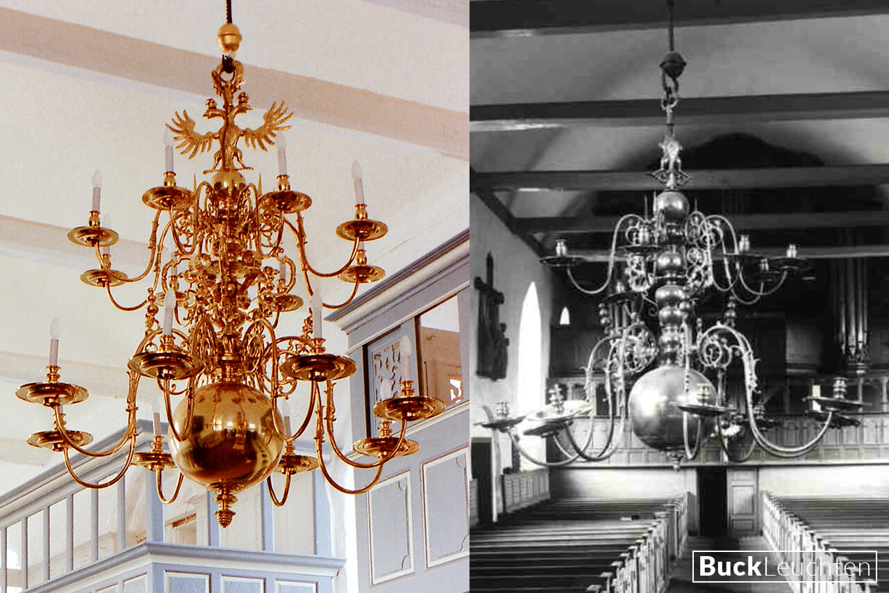 Der sehr reich geschmückte Barockleuchter in Mittelnkirchen bei Stade wurde während des Krieges eingeschmolzen. Der Leuchter konnte anhand eines hier auch zu sehenden Archivfotos rekonstruiert werden.