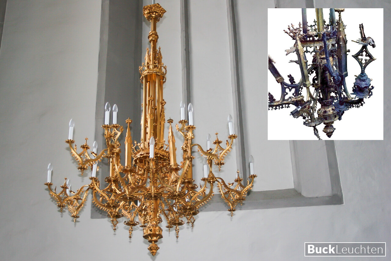 Rekonstruktion des Leuchters aus der 2. Hälfte des 19. Jahrhunderts. Der Leuchter war bis auf die gezeigten Fragmente durch einen Brand während des Krieges zerstört worden. Alle fehlenden Teile wurden in Messing nachgegossen. Danach wurde der Kronleuchter wieder vergoldet.