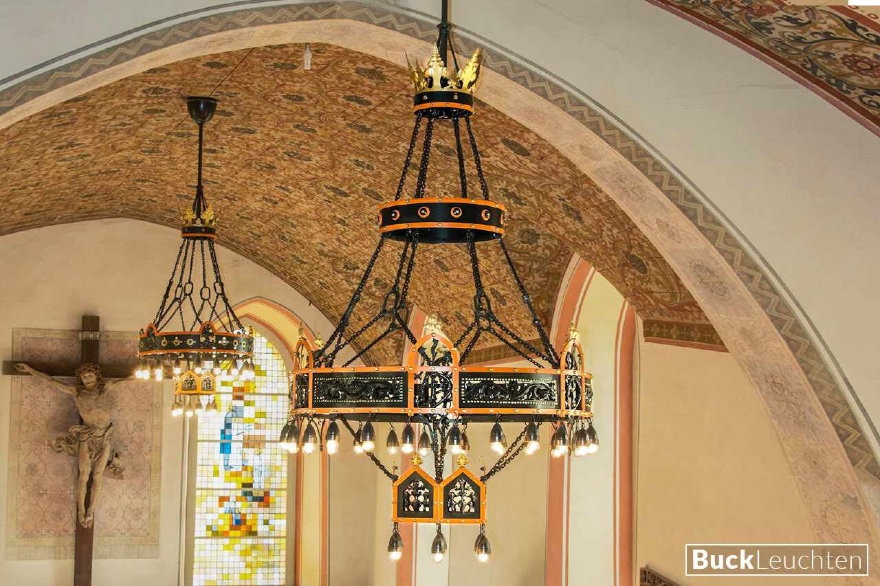 Hier durften die ehemals vorhandenen, abgängigen drei Kronleuchter komplett nach alten Fotos rekonstruiert werden. Nach der Anfertigung von Zeichnungen und Mustern wurden die Kronleuchter sehr detailreich in sehr intensiver Zusammenarbeit mit der Denkmalpflege und der sehr engagierten Kirchengemeinde wiederhergestellt. Die ursprüngliche Farbgebung wurde, in Anlehnung an die Ausmalung des Deckenspiegels, mit der Denkmalpflege sehr genau abgestimmt und ausgeführt. Auch die ehemals vorhandenen Deckenleuchten unter der Westempore wurden nach alten Fotos rekonstruiert und wieder angefertigt.