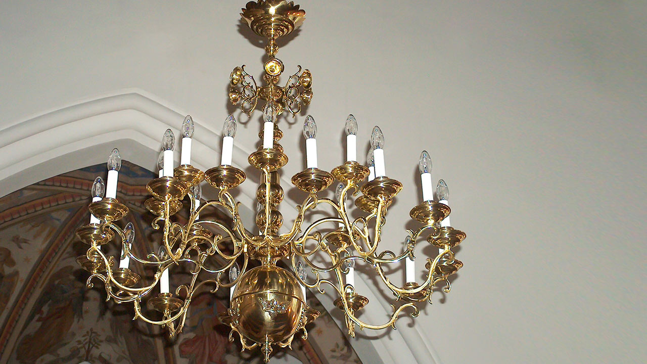 Abgängige Einzelteile der Leuchter wurden im Messing-Sandguss-Verfahren nachgefertigt, punziert und von Hand in ihre zuständigen Passungen eingefügt.